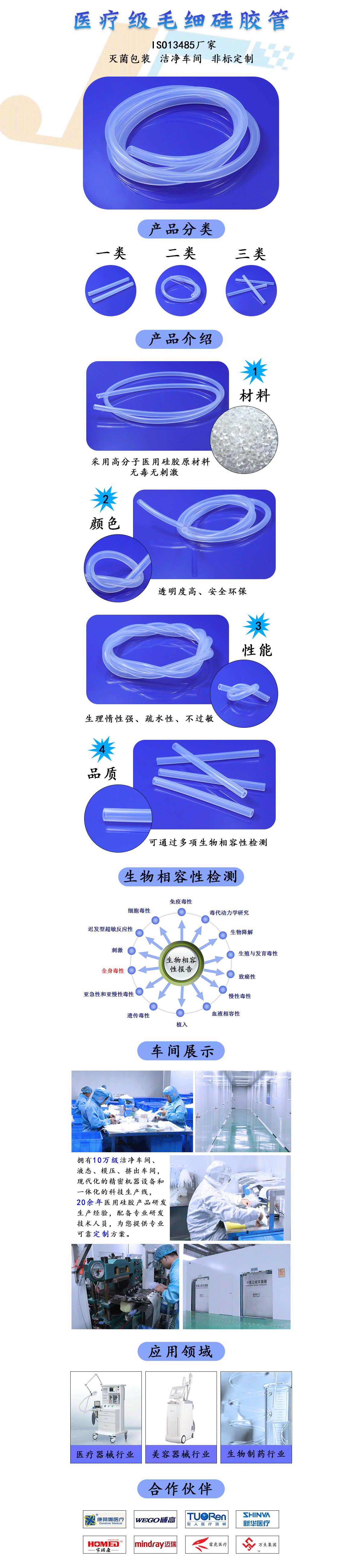 ![]() 醫用硅膠管均采用原材進口硅橡膠料,最小直徑可做到1毫米,通過生物相容性測試,對人體組織的反應很小,在醫療衛生方面獲得愈來越廣泛的應用。 醫療級毛細硅膠管性能:1.彈性好,耐扭結不變形,柔軟; 2.耐候性,耐腐蝕,耐弱酸弱堿,無析出物,具有生理惰性; 3.耐寒耐高溫,耐弱酸堿,對人體無毒無刺激,疏水,透氣; 4.無害無毒無味,透明度高,耐水解,耐手機油,耐黃變,抗老化; 醫療級毛細硅膠管用途: 醫療級毛細硅膠管適用于食品加工、醫療機械、呼吸機、醫藥導流、生物制藥、醫療科研、醫用分析儀器、止血儀器、生物研究所、化學實驗室等領域。 |