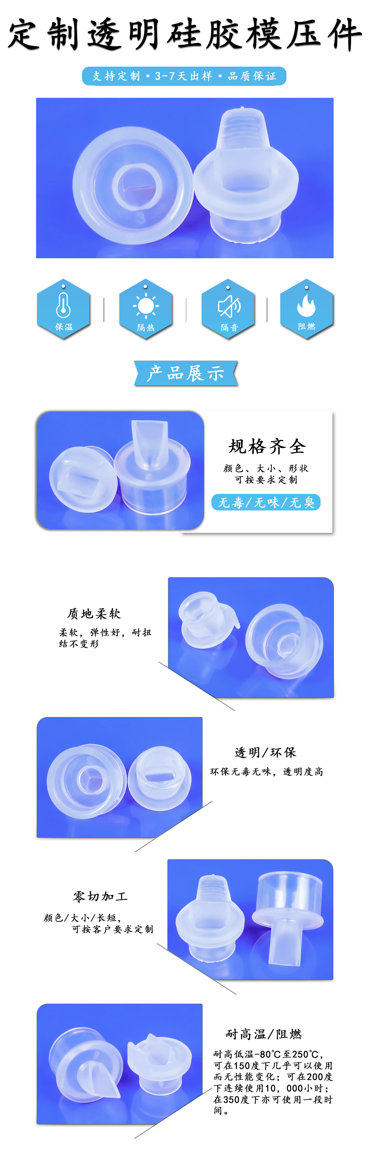 定制透明硅膠模壓件: 采用優質醫療級硅膠原料制作,具有良好的物理特性,無毒無味且沒有過敏反應,柔軟高透明可高溫消毒 定制透明硅膠模壓件性能: